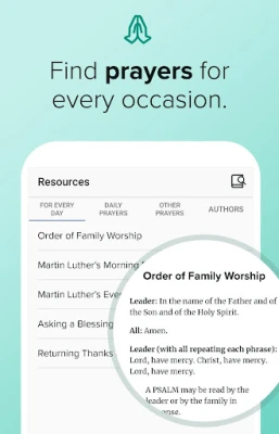 The "Prayers" tab is now called "Resources" and includes daily prayers, prayers for special occasions, and author biographies.