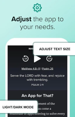 An updated design allows for a sleek and modern devotions screen. Press the Play button in the middle of the image to hear your audio devotion. Swipe right or left to see previous or future devotions.